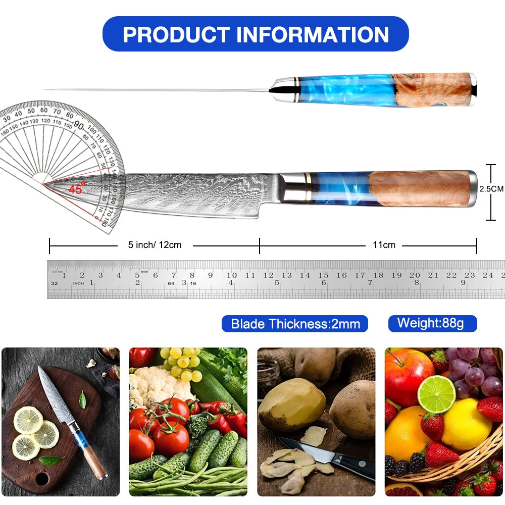 Discover the perfect combination of precision, durability, and elegance with this 5-Inch VG10 Damascus Steel Paring Knife. Featuring a ruthlessly sharp, scalpel-like edge hand-finished to a mirror polish at an 8-12° angle per side using the traditional Honbazuke method, this knife guarantees unparalleled precision. Crafted with a VG10 Japanese super steel core at 60+ Rockwell hardness and encased in 67 layers of high-carbon stainless steel, it delivers extraordinary performance, edge retention, and corrosion resistance. The ergonomic abalone shell acrylic handle offers superior control, agility, and comfort, while the full tang and triple-riveted design ensure ultimate durability. Enhanced with a stunning ‘tsunami-rose’ Damascus pattern, this knife is perfectly balanced and engineered for effortless cutting with minimized surface resistance and enhanced non-stick properties. Elevate your kitchen with this revolutionary blend of beauty, power, and performance.