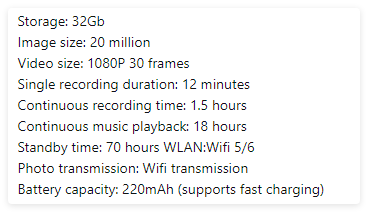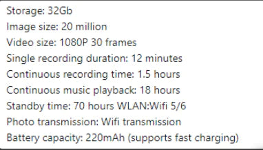 Smart AI camera glasses with HD video, anti-shake recording, voice call, translation, and object recognition. Touch controls, ABS material, 390mAh battery. Sunglasses and transparent lens options. Includes case, cable, and cloth.