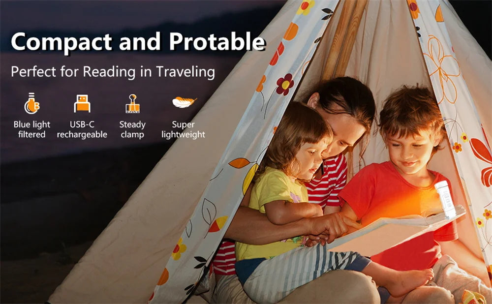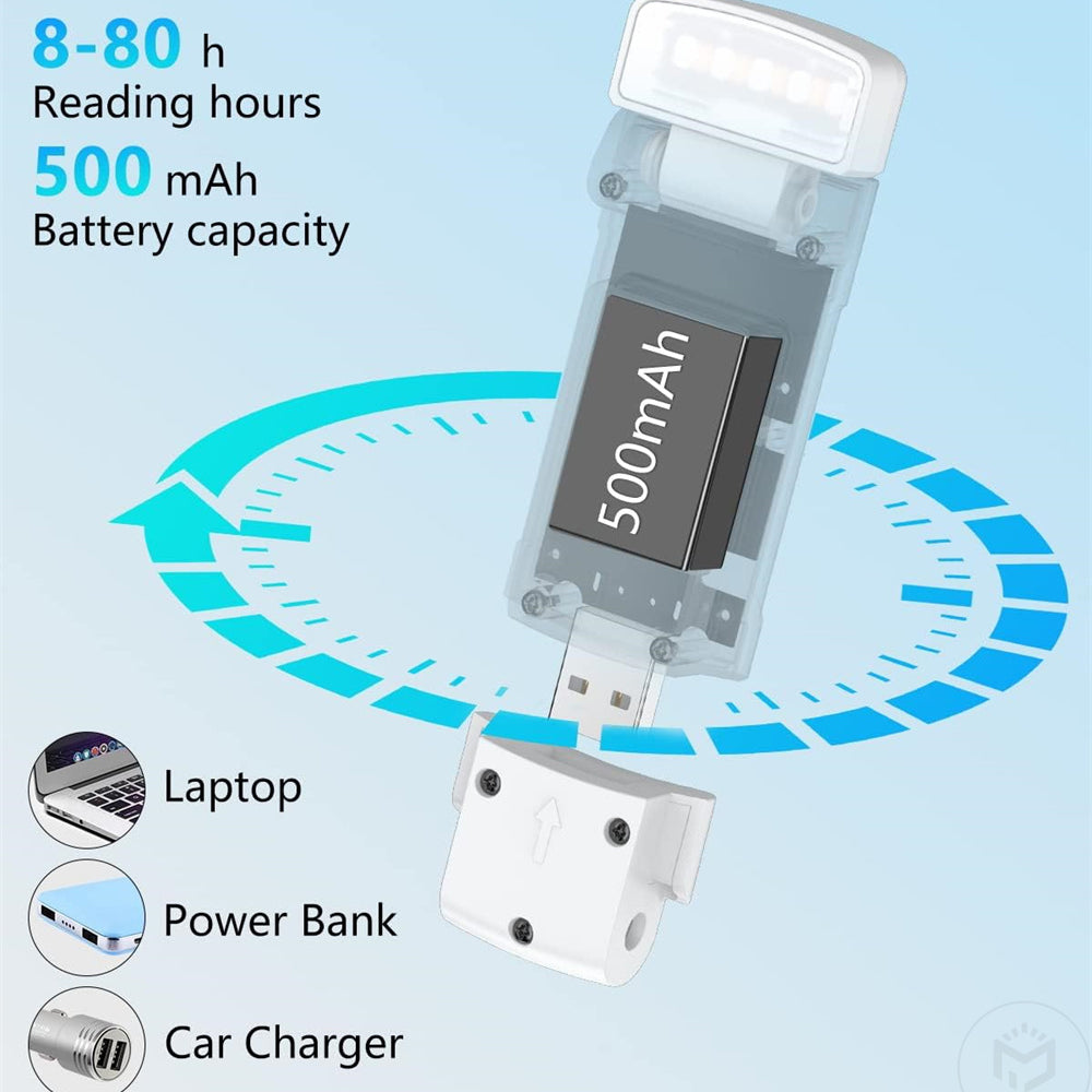 Standard USB rechargeable and directly lug it into your laptop, power bank, adapter, car charger, or USB outlet for recharging, no additional cables needed. The booklight was built-in 500 mAh battery provides 8 hours reading time in the highest setting, and up to 80 Hrs reading time in the lowest setting. There are 4 battery power indicator and you can tell how much power left at any time.